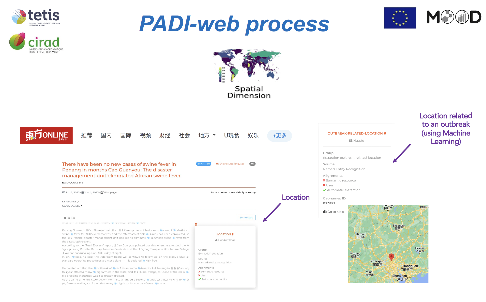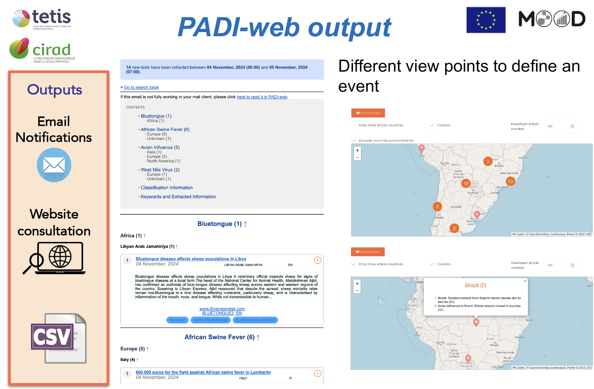 Lors de la session consacrée à la veille événementielle, Mathieu Roche a présenté les méthodes en IA développées pour analyser les informations spatio-temporelles et thématiques issues des médias via la plateforme PADI-web. Cette intervention a été suivie de deux présentations illustrant l’application de ces approches en santé animale (UMR ASTRE) et en santé des plantes (UMR PHIM et ESV). L’ensemble met en lumière la dimension pluridisciplinaire des travaux menés au sein de TETIS, pleinement inscrits dans la démarche One Health / Une seule santé, à l’interface entre environnement, santé et société.