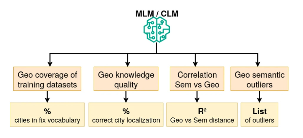 Pour cela, un cadre original d’analyse a été introduit reposant sur quatre indicateurs complémentaires : l’analyse des tokenizers pour estimer la couverture géographique des données d’entraînement, l’évaluation des connaissances géographiques de base, l'analyse de corrélation entre distance sémantique et distance géographique ainsi que la cartographie des distorsions géographiques.