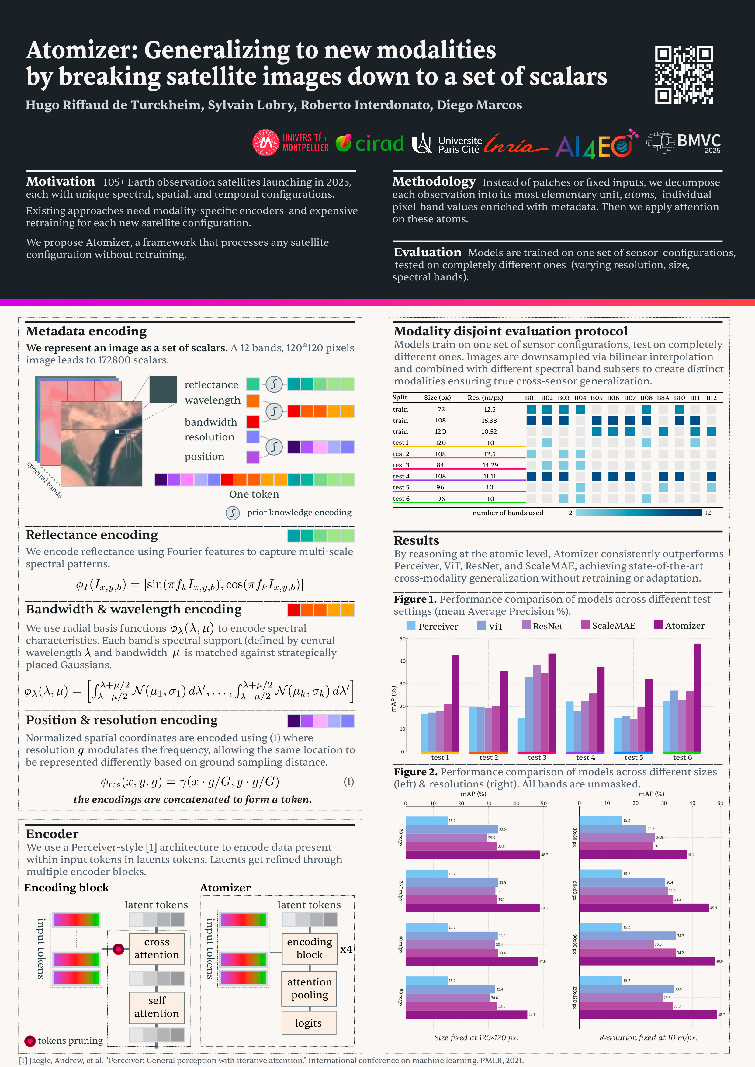 Cette année, l’article intitulé « Atomizer: Generalizing to unseen modalities by breaking images down to a set of scalars »a été recompensé par le Best Presentation Award. Ce travail propose une approche innovante permettant aux modèles de vision de s’adapter à des modalités d’images jamais vues auparavant — par exemple des images composées de bandes spectrales de nature différente — en décomposant les images en ensembles de scalaires.